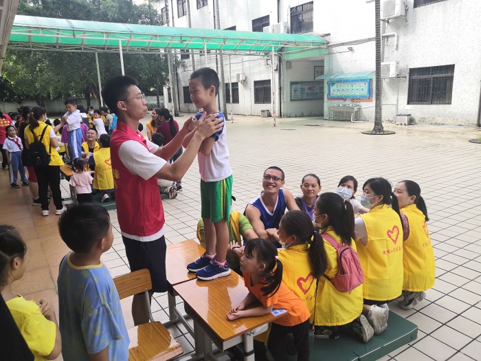 隨后,親子義工們“小手拉大手”,在團隊活動中體會垃圾分類,團結協作的好處,“珠行萬里”、“無敵風火輪”、“信任背摔”,充滿教育意義的團隊游戲讓大小朋友“玩”在一起,學在一起。