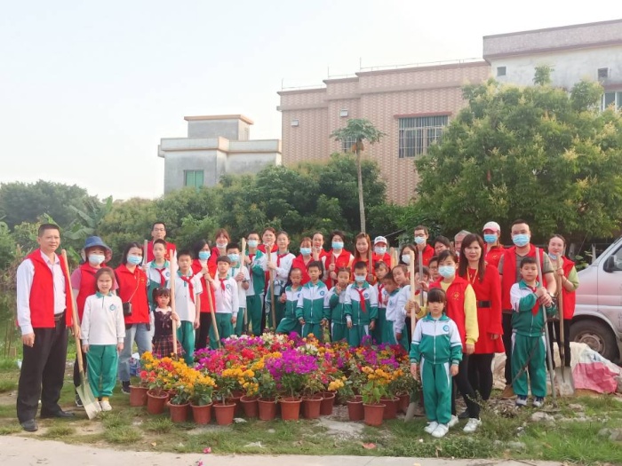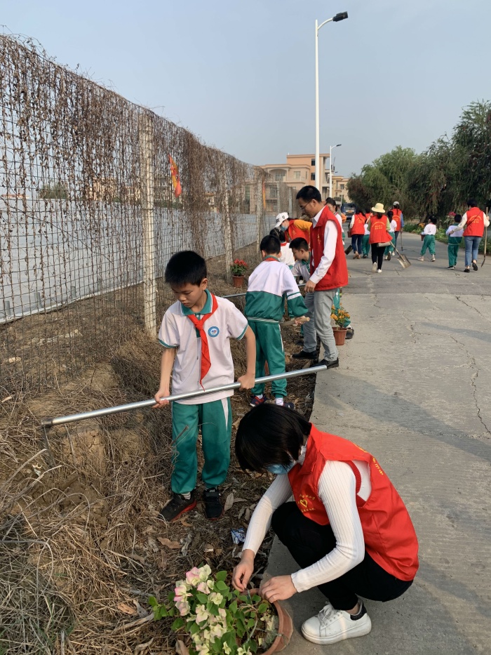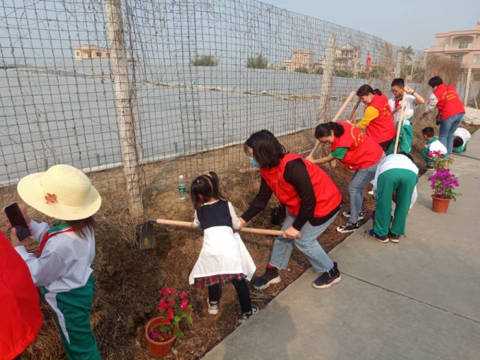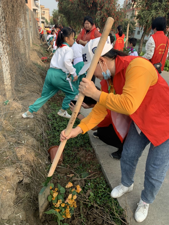 活動(dòng)當(dāng)天,在崔煥英校長的親自帶領(lǐng)下,親子義工們有挖坑的,有扶著樹苗的,有填土的,還有提著水桶來回澆水的,打支撐的,干得熱火朝天。當(dāng)中有不少孩子都是第一次參加植樹,動(dòng)作稍顯笨拙,但絲毫不影響他們對(duì)植樹節(jié)勞動(dòng)的積極與熱情。家長們手把手地指導(dǎo),并提示孩子們注意安全。兩個(gè)多小時(shí)過去,在全體親子義工的努力下,栽種工作順利完成,共栽植三角梅一百五十余株。輕柔的春風(fēng)中,看著自己親手種下的一棵棵小樹,暢想著數(shù)年以后它們慢慢長大,枝繁葉茂,孩子們臉上露出了燦爛的笑容。