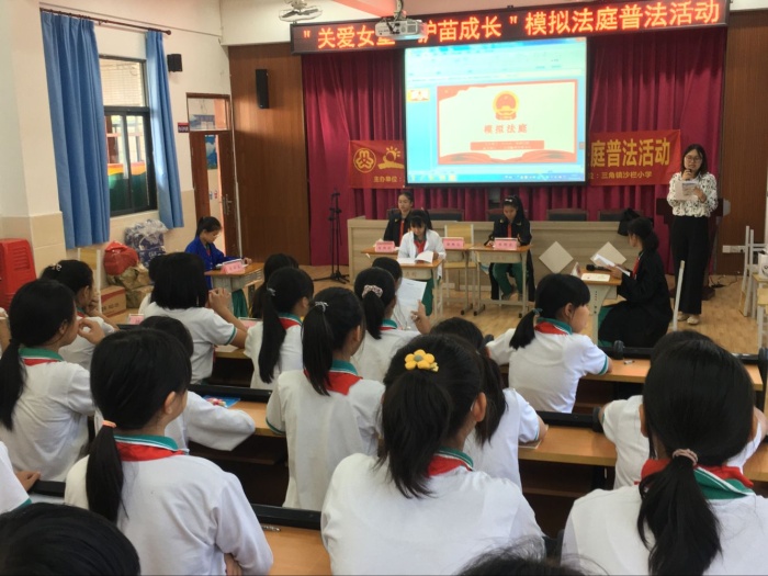 為進一步增強女童自我保護意識,提升女童自我保護能力,依法維護女童合法權益,促進女童安全健康成長。10月26日下午,由中山市三角鎮婦聯組織,廣東國融律師事務所承辦的“模擬法庭”普法活動在三角鎮沙欄小學正式拉開帷幕。此次模擬法庭,開庭審理的是一件涉及性侵的犯罪案例。學生們分別扮演“審判員、書記員、公訴人、辯護人、法定代理人、法警”等角色,親身經歷了一場別開生面的庭審現場。參與庭審的同學們積極認真,將整個庭審過程中的每一個角色都演繹得惟妙惟俏,真實生動地再現了莊嚴的庭審過程,讓五六年級的女同學能近距離地感受法律的莊嚴神圣。