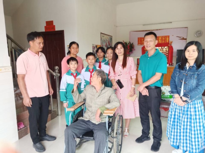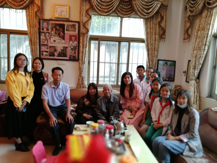 活動中,沙欄小學黨群服務隊在崔煥英校長的帶領下,走進退休老教師的家中,與他們促膝談心、噓寒問暖、仔細詢問他們的身體狀況,并向他們送上重陽節慰問品,祝愿他們身體健康、幸福長壽、節日愉快。少先隊員們也恭恭敬敬地走到老前輩們面前,為他們獻上了節日的問候。一句溫馨的祝福,一個溫暖的擁抱……都讓老教師們感覺到了節日的溫暖氣氛。
