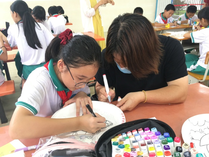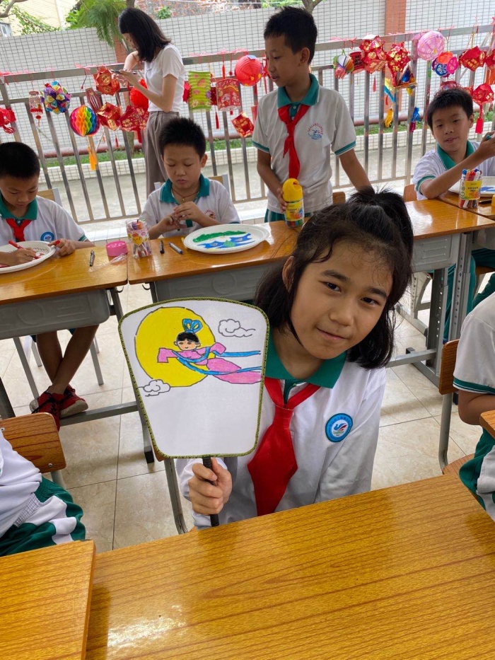 活動開始前,美術老師為每位學生準備了空白的古扇、圓紙盤和種類齊全的繪畫工具,并由吳艮英老師和劉顯眾老師對繪畫的上色技巧和注意事項進行了詳細的講解,接著就是學生們開啟創作之旅。圓紙盤的繪畫形式多樣,有畫植物的,例如竹子、鮮花、樹木等;也有畫動物的,例如鯨魚、蜜蜂、蝴蝶等。古扇的繪畫圍繞雙節為主題,一幅幅栩栩如生的圖畫在學生手中的書畫筆逐漸成型,以繪畫形式共同祝福我們親愛的祖國國泰民安、繁榮昌盛。