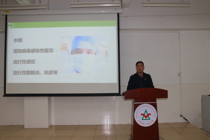 緊接著,陳校長以《學校冬季常見傳染病及防控要求》為題,從學校冬季常見傳染病、常見傳染病隔離期限及疫情報告標準、智立方管理平臺預警處理流程三個方面詳細解讀了當前學校傳染病的形勢與任務,并從傳染病的病原學、流行病學特征等方面為大家介紹了學校常見的水痘、諾如病毒感染性腹瀉、流行性感冒、流行性腮腺炎、風疹等傳染性疾病的一般知識和防治措施,為進一步做好學校衛生工作提供了非常好的建議和思路。