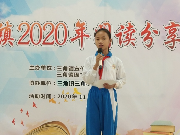 為創(chuàng)建國家公共文化服務體系示范區(qū),深入實施素質教育,創(chuàng)建良好校園文化,營造濃郁讀書氛圍,由三角鎮(zhèn)宣傳文化服務中心、三角鎮(zhèn)圖書館主辦,三角鎮(zhèn)三角小學協(xié)辦的主題為“書香伴我成長”悅讀分享活動,于2020年11月18日下午兩點在三角小學階梯教室舉行。本次活動由少先隊大隊輔導員廖樂詩老師及六(3)班趙文熙同學主持。三角鎮(zhèn)圖書館館長林贊昌、三角小學王輝副校長、陳寶瑩主任、楊穗珊副主任以及三角小學部分師生參加了此次活動。