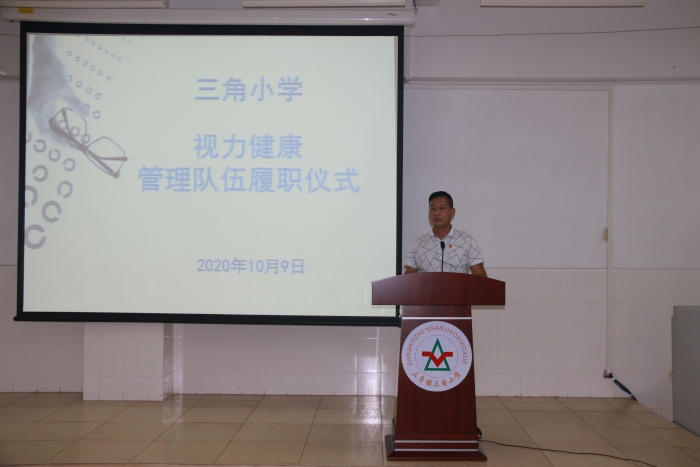 當天下午,中山市三角鎮三角小學在學校階梯室舉行學生視力管理隊伍成立儀式,學校全體行政、班主任和家長及學生代表參加了本次活動,活動由學校總務處何應文主任主持。