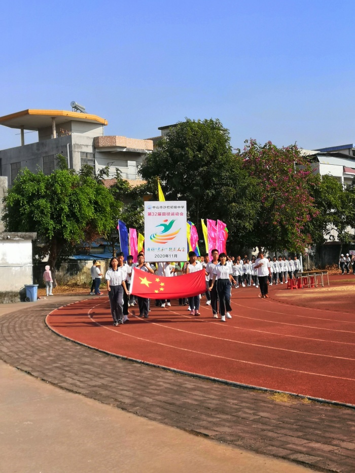 風和日麗,冬日暖陽,該校操場傳遞著運動的激情。沙中人齊聚一堂,共赴運動盛會。進場音樂在足球場內悠揚響起,各方陣隊伍整齊林立在運動場內。入場儀式正式開始,國旗護衛隊、校旗護衛隊、校徽護衛隊分別護衛著國旗、校旗、校徽率先入場。他們踏著鏗鏘的步伐,威武雄壯地通過主席臺。各班運動員代表揮舞各具特色的班級標識,喊著嘹亮的班級口號,步伐整齊地入場。
