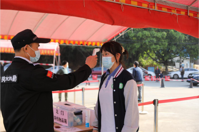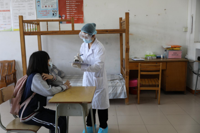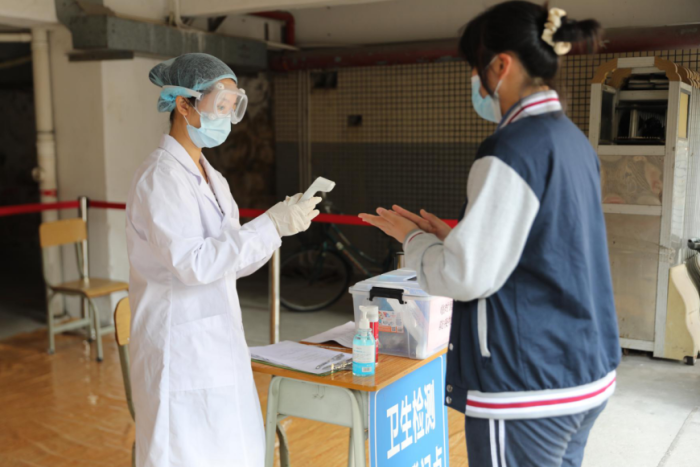 本次演練共預設了“返校入校管理”“學生就餐”“教室突發異常情況”“隔離室復查、轉運及跟蹤處置”“學校疫情防控領導小組啟動應急預案”等場景,通過現場情景演示,結合旁白解說的方式,將校園疫情防控工作的每一個關鍵節點形象真實地演練出來。上午九點整,溫結聯校長宣布“2021年春季新學期疫情防控演練開始”,演練按照預設流程依次進行。其中,“返校入校管理”在學校正門口進行,“學生就餐”在學校飯堂進行,“教室突發異常情況”在教室進行,“隔離室復查、轉運及跟蹤處置”在校醫室進行。