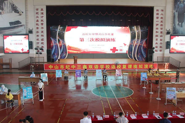 伴隨著夏風(fēng)習(xí)習(xí),這個(gè)超長(zhǎng)寒假終于慢慢走向了終點(diǎn)。繼首批初三、高三學(xué)生返校復(fù)課之后,5月11日,初一和初二年級(jí)的同學(xué)們也將迎來(lái)復(fù)課,回到他們心心念念的教室開(kāi)始正常的學(xué)習(xí)生活。為進(jìn)一步提高三鑫師生疫情防控意識(shí)和疫情應(yīng)急處置能力,嚴(yán)防疫情輸入校園,確保返校復(fù)課后良好的教育教學(xué)秩序,維護(hù)師生健康和安全。5月6日下午,紀(jì)中三鑫雙語(yǔ)學(xué)校初一、初二年級(jí)聯(lián)合生活部一起在學(xué)校體育館舉行了“第二、三批學(xué)生返校復(fù)課異常情況應(yīng)急處置演練”。 此次演練主要模擬的情景是“就餐中發(fā)現(xiàn)某學(xué)生咳嗽并檢測(cè)到發(fā)熱的應(yīng)急處置”。