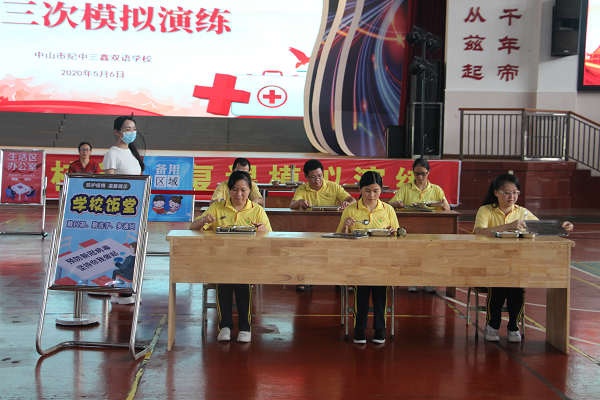 演練從餐前學(xué)生(學(xué)生由生活部老師扮演)排隊(duì)洗手、進(jìn)入餐廳開(kāi)始。學(xué)生在進(jìn)入飯?zhí)们坝行蚺抨?duì)用“七步洗手法”洗手,然后進(jìn)入餐廳隔位而坐,摘下口罩開(kāi)始進(jìn)餐。進(jìn)餐過(guò)程中有學(xué)生咳嗽難受,生活老師發(fā)現(xiàn)后為該生體溫檢測(cè)為37.6℃,立即提醒周邊同學(xué)們佩戴口罩,并通知樓長(zhǎng)帶領(lǐng)周邊同學(xué)到備用區(qū)重新配餐、就餐。生活老師報(bào)告醫(yī)務(wù)室以及生活部主管,帶領(lǐng)該生前往留觀室做詳細(xì)檢查。醫(yī)生為該生做更進(jìn)一步檢查和相關(guān)詢問(wèn)后,將異常情況匯報(bào)給沈偉忠校長(zhǎng)以及該生的生活老師、班主任。沈偉忠校長(zhǎng)收到反饋信息后,向上級(jí)教育部門匯報(bào)。校醫(yī)室立即向鎮(zhèn)疾控中心報(bào)告,班主任立即向家長(zhǎng)通報(bào)情況,校醫(yī)通知總務(wù)處安排人員對(duì)餐廳進(jìn)行消毒。最后,疾控部門到場(chǎng)處理,接學(xué)生到醫(yī)院就診。沈校長(zhǎng)馬上召集相關(guān)部門的管理人員會(huì)議,啟動(dòng)緊急應(yīng)急處置預(yù)案。