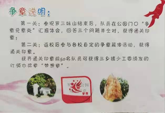 回到公園門口,隊(duì)員們在“爭章兌章處”匯報學(xué)習(xí)體會,踴躍答題,積極參與兌章活動,獲取通關(guān)印章(第一關(guān)),返校后參與各校自定的延伸活動(即第二關(guān)),各校集齊通關(guān)印章前50名的隊(duì)員可獲得三鄉(xiāng)鎮(zhèn)少工委頒發(fā)的紅領(lǐng)巾“夢想章”。
