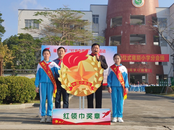 緊接著由陳苕校長、林良友主任和學生代表,帶領學生們宣布開啟“紅領巾爭章啟動儀式”。