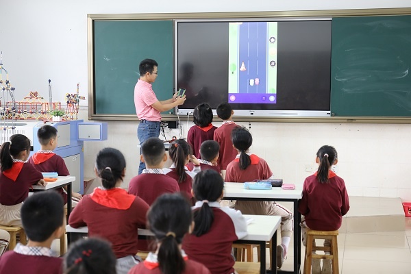 第三節課由豐華學校陳小樂老師展示四年級科學《車動了嗎》。陳老師充分結合信息技術手段和多媒體技術,讓學生體驗并觀察其自制的賽車小游戲,學生在有趣的游戲中發現參照物改變,物體的運動狀態也會改變。接著,陳老師模擬人在公交車上的場景,讓學生分析并模擬場景,結合投屏、攝影等手段讓學生在活動中理解了“運動”的條件。