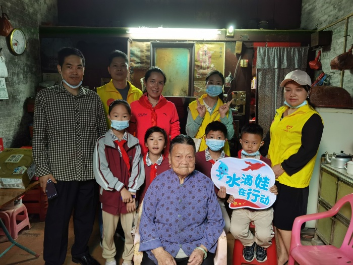 陳文麗老師帶隊的小組去到茅灣村一位老人的家里,看到隊員們的到來,笑得特別開心,趕緊開門迎接我們進去,還拿凳子招呼我們坐下。家里不大,但是環境還算整潔,我們發現老人家里墻上掛著一張張照片,隨著時間的流逝,這些照片早已失去了原有的亮色,照片中的人也有些模糊不清。子女不在身邊,老人經常守著孤獨的日夜,唯有看著墻上的照片,才能讓老人家找到一絲絲的思念和精神寄托。老人家經常說一句話:“你們有心了,以后不需要拿那么東西來了,你們能來,我就很歡喜。”其實老人的生活就是需要我們的關心和理解,多一點微笑、多一點關懷,他們也就不覺得寂寞了。老人們感受到了隊員們的真誠,家長們的關心。最后家長及隊員們和老人一起合影留念,留下一些美好的回憶。