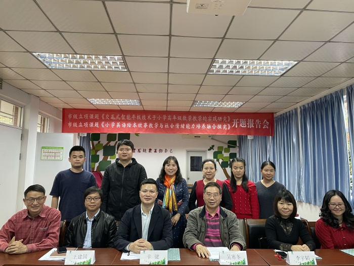 為扎實推進課題開展,不斷激發教師的科研熱情。2021年3月26日下午,三鄉鎮平嵐小學舉行了中山市教育科研2020年立項的課題《交互式智能平板技術于小學高年級數學教學的實踐研究》和青年課題《小學英語繪本故事教學與社會情緒力培養融合探究》的開題報告會。活動邀請了市教體局教師發展中心、市中小學教師信息技術應用能力提升工程2.0辦公室主任吳寒冬教授、市小學英語教研員辛鍵老師、五桂山學校李宇韜副校長、 三鄉鎮教育和體育指導中心王建國主任、 三鄉鎮小學英語中心教研組組長趙淑珍副主任。參會的還有劉杰校長、平嵐小學數學科組、英語科組以及兄弟學校的老師們。