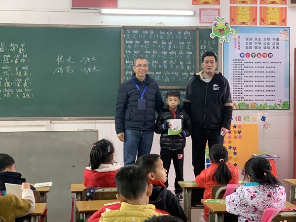 檢查組首先到中心小學二(2)班課室為王良政同學頒獎,王良政的作品《愛眼問答比賽》在2020年全國愛眼日廣東省中小學生愛眼護眼作品征集活動榮獲攝影作品小學組優秀獎。中山市衛生局領導祝賀王良政同學獲獎,并倡議同學們要向他學習。隨后,何主任為二(2)班的孩子發放了“關注眼睛健康、遠離近視眼”資料,并對學生開展了近視防控講座,讓學生了解到近視的危害,如何預防近視,愛護眼睛。