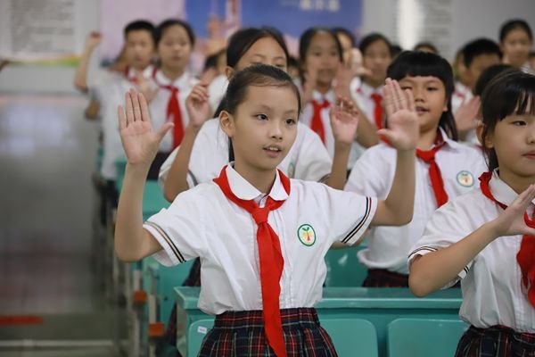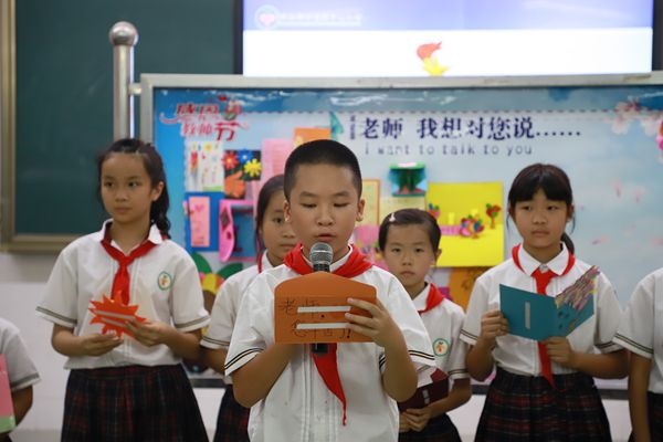 下午3點(diǎn),大隊(duì)委委員宣布活動(dòng)開始,出隊(duì)旗,敬隊(duì)禮,活動(dòng)在莊嚴(yán)肅穆的氛圍中拉開了序幕。首先是四(3)班中隊(duì)李卓軒、劉若妍為教師節(jié)獻(xiàn)詞,他們聲情并茂地朗誦了一首詩(shī)歌,感染了在場(chǎng)的師生們。接著是心意卡展示,各班代表手執(zhí)自制精美的心意卡在臺(tái)前傾訴對(duì)老師的熱愛和祝福,然后將其掛在心意墻上。緊接著,校合唱隊(duì)演唱了一首世界名曲《可愛的家》,將校園比作大家庭,唱出了對(duì)老師的感恩和愛戴。歌聲悠揚(yáng)動(dòng)聽,贏得了同學(xué)們熱烈的掌聲。合唱結(jié)束后,全體教師上臺(tái)宣誓,重溫教師誓言,不忘初心,牢記使命,做“四有”好老師,做好學(xué)生引路人。宣誓完畢,孩子們?yōu)槔蠋煫I(xiàn)上鮮花,并表演手語(yǔ)歌《聽我說,謝謝你》,孩子們的眼里充滿深情,動(dòng)作整齊劃一,童聲真摯悅耳,現(xiàn)場(chǎng)氣氛溫馨感人。最后,少先隊(duì)輔導(dǎo)員伍煜獻(xiàn)老師帶領(lǐng)隊(duì)員們呼號(hào):“準(zhǔn)備著:為共產(chǎn)主義事業(yè)而奮斗!”全體少先隊(duì)員齊聲回應(yīng): “ 時(shí)刻準(zhǔn)備著!”活動(dòng)在孩子們激昂的呼號(hào)聲中落下帷幕,取得了圓滿的成功。