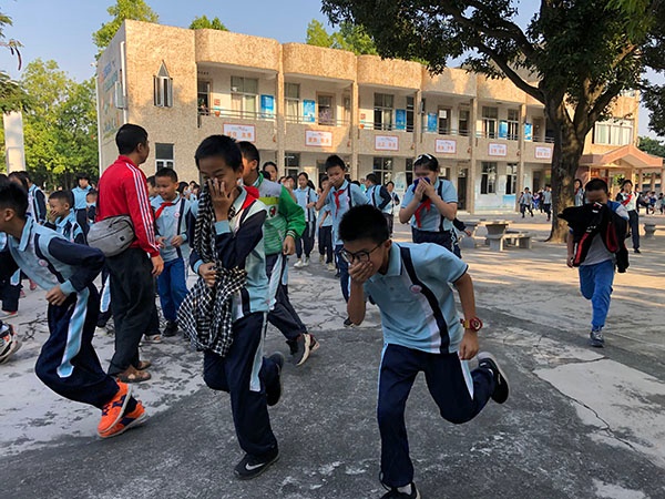 演練開始前,各班主任再一次強調演練重點,全校師生從接到指令,到撤離到指定安全地帶,只用了不到2分鐘。警報響起后,同學們快速地離開課室,以手帕、毛巾或者衣物遮掩口鼻,俯身前進,途中高年級注意避讓、照顧低年級的同學。整個過程緊張有序、沒有出現擁擠摔倒現象,同學們能按照要求認真對待,安全防范意識強烈。老師組織到位,保障有力,保證了這次演練的成功。
