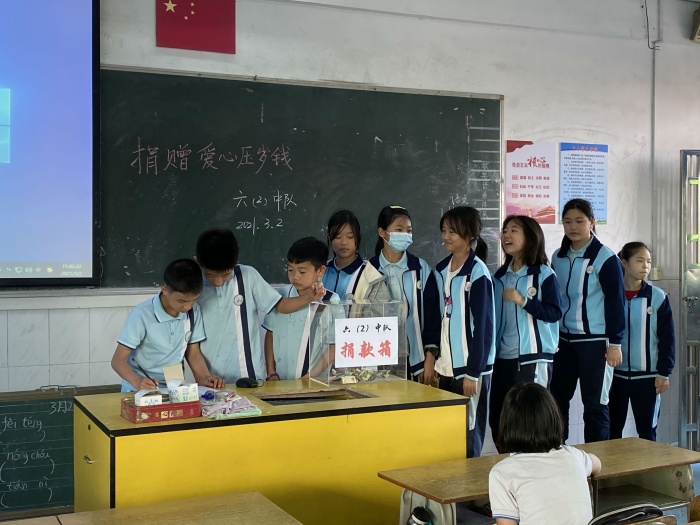 3月2日下午,在大隊(duì)部的部署下,所有中隊(duì)利用隊(duì)課在教室里舉行了簡單而又隆重的捐贈壓歲錢活動。