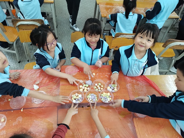 品嘗完美味的湯圓,各班開展動手制作做湯圓活動。同學們興趣盎然,三個一組,五人一群,圍在一起,在義工家長的指導下,和面粉,揉捏面團,在面團里包各種各樣準備好的餡料。同學們都說,包湯圓真好玩,一定要把自己包的湯圓帶回家,與家人一起分享。