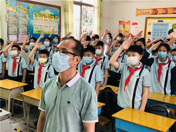 龍頭環學校嚴格執行上級規定,一切以確保學生人身安全與身心健康為前提,把控好學生返校后校園學習生活的每一個環節。早上,天色尚不明朗,龍頭環學校的教師們早已回到學校并站到指定的崗位,吳發志校長到校門口迎接學子們并指揮大家按規定有序進入校園。家長義工們在校園門口協助學生按照間隔不少于一米的距離排隊進校,網格管理教師和駐校醫生在旁邊隨時候命,所有學生在通過人臉識別測溫系統進入校園后,還必須進行洗手、足部消毒等環節,整個入校過程安靜迅速,整齊有序。