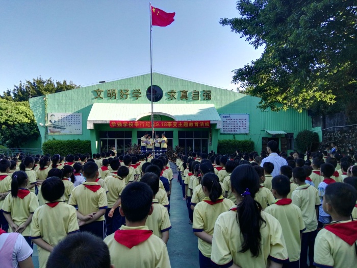 在升旗臺前,團員們、少先隊員們身著統一的服裝,擺成了“9·18”數字,給師生強烈的心靈震撼,讓大家深感振奮。華強少工委各中隊代表進行了愛國主義詩朗誦,激發輔導員們和隊員們的愛國主義情懷;德育處周主任向隊員們講述了九·一八事件的經過,教育廣大隊員們要了解并時刻銘記那段中國人民屈辱的歷史,牢記中華兒女前赴后繼、浴血奮戰抵抗日本侵略者的豐功偉績。