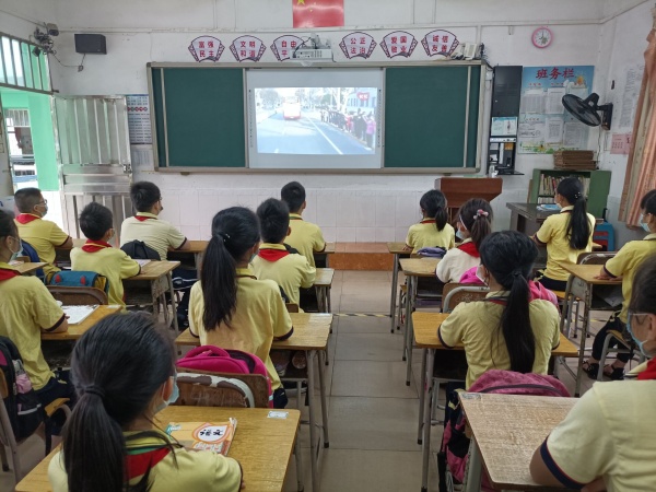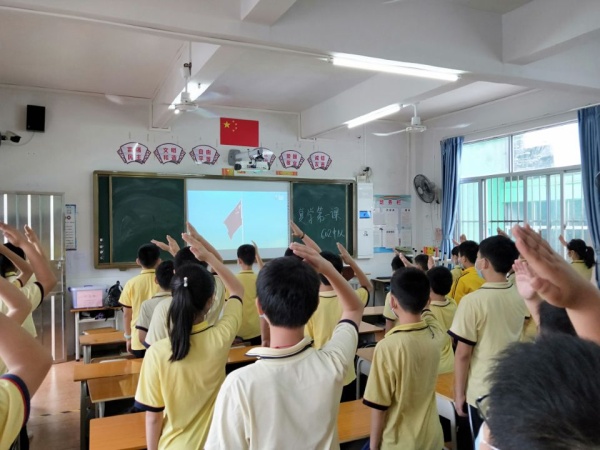今天的第一節課是班會課,主題是觀看市教育和體育局制作的《復學第一課》。開篇的畫面是奏國歌升國旗,同學們非常自覺的在座位上肅立,面對屏幕,行隊禮,宏亮的國歌聲在教室里回響。
