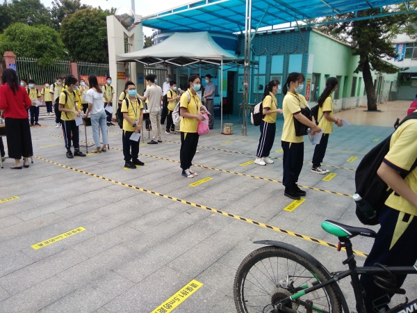 早上,學校行政和教師已經在校門迎候返校的同學們,提前準備好四個入校通道,準備測溫用的額溫槍,免洗消毒液,值日教師到崗。學校行政和責任交警一起負責疏導校門口的交通秩序,引導同學們保持好間距排隊,接受值日老師的測溫和掃碼,一切正常才能順利進校。