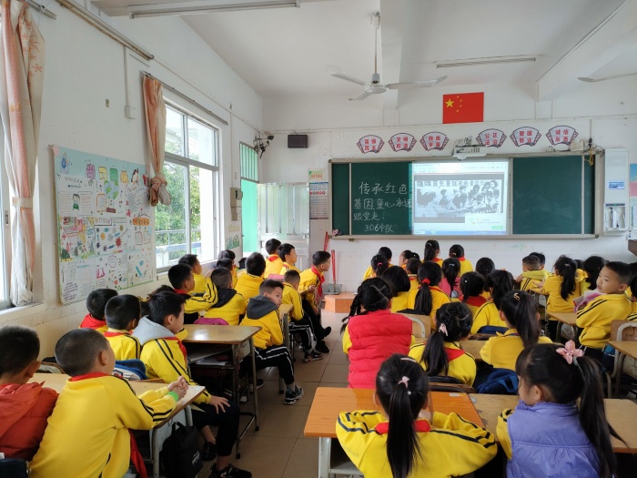 升旗儀式后各中隊進行“傳承紅色基因?童心永遠跟黨走”主題隊會。