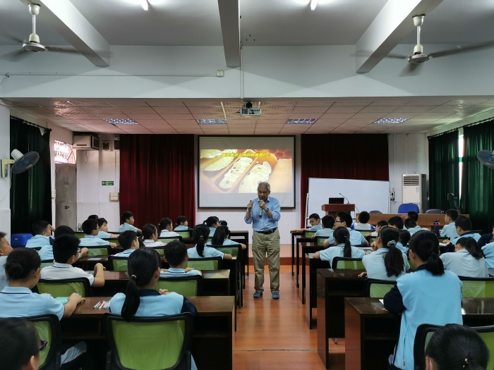 講座中,陳老師以“好奇------引領(lǐng)我們探究未知世界”為主題,從自己一次偶然發(fā)現(xiàn)小小的蜜蜂在商場門口大量死亡這件事產(chǎn)生好奇進行的探究開始,用淺顯易懂、詼諧幽默的語言,圖文并茂的形式介紹了蜜蜂與自然和諧共處的關(guān)系,揭示自然界蘊藏著許多鮮為人知的奧秘,讓學(xué)生們感悟到生命的偉大與自然界的奧妙,給人類許多的啟迪。并從愛因斯坦、弗萊明等科學(xué)家的故事中引出,科學(xué)家之所以成為科學(xué)家,從小好奇是其中的一個不可或缺的原因,正如愛因斯坦所說:“我沒有特殊的才能,只是激情般的好奇”,“如果你能從好奇中抓住機會仔細觀察,你也可以獲得機會去發(fā)現(xiàn)”,并例舉“響尾蛇導(dǎo)彈”發(fā)現(xiàn)的原因和一名四年級學(xué)生用粘膠帶綁在樹干上阻止蟲子吃樹葉獲全國獎的故事,牢牢地吸引著學(xué)生們的注意力,引起了學(xué)生們對科學(xué)的無限渴望和對科學(xué)知識強烈的求知欲。陳老師邊講邊問,同學(xué)們爭相搶答,運用已有的科學(xué)知識,與科學(xué)家一起熱情互動,掀起了講座一次又一次的浪潮。陳老師還告訴同學(xué)們,發(fā)明創(chuàng)造并不遙遠,每個人都是天生的科學(xué)家、創(chuàng)造家、發(fā)明家,只要充滿好奇,善于去發(fā)現(xiàn)、去探究,生活中處處是科學(xué)。