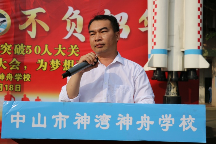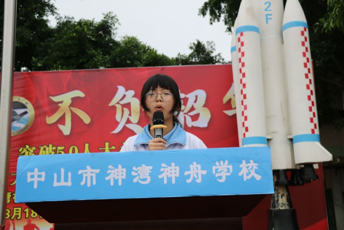 上午八點三十分點,在全體師生的見證下,神舟學校常務校長奚水清進行莊嚴的揭牌儀式:中山市神灣神舟學校中考倒計時100天。全體學生以雷鳴般的掌聲迎接倒計時100天的到來。