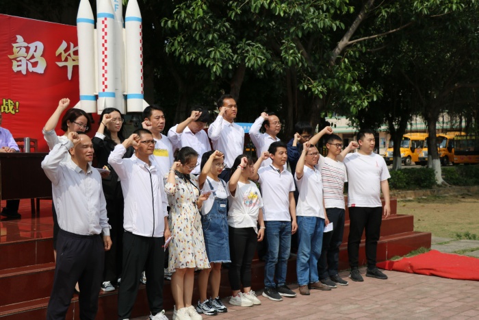 最后,全體九年級老師在教導處韋紹祖主任領誓下進行了中考百日誓師教師宣誓。教師誓詞: