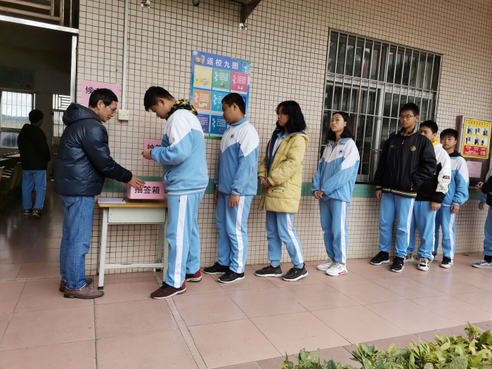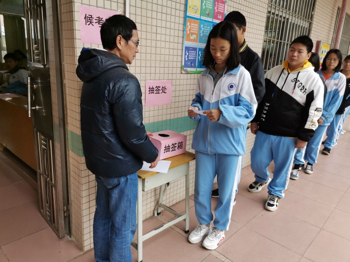 上午8點10分由考務員到班通知第一場學生24人到多媒體準備室抽簽,抽簽后,學生利用5分鐘時間了解實驗題操作的要求、步驟、注意事項等。8點15分學生有序地進入操作考核室,8點20分整計時員宣布考核開始,神舟學校六位監考教師收卷當場評分,評分結束后,接著進第下一場學生的操作考核。10點左右,神灣鎮教育事務指導中心吳惠欣老師、神灣中學物理老師陳木奇來到神舟學校巡查,監控了初三(2)班的第四場考核過程,包括學生的抽簽,學生實驗操作和物理教師對學生操作考核打分情況及整體學生的操作考核水平都進行了監督和了解。巡查組對每位監考教師每人監考兩位同學操作,考核的學生沉著操作,對實驗考核工作表示滿意,同時也向學校提出具體的改進建議。