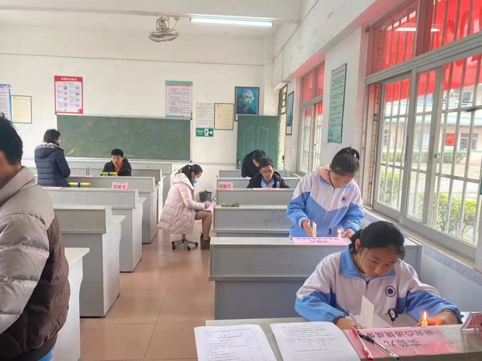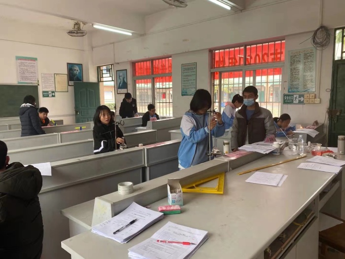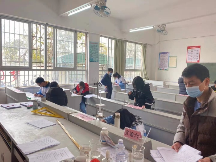 為準備此次物理實驗考核,在實驗操作考核前一個月,教導主任韋紹祖對物理實驗操作考核的物理教師,考務員專門召開會議,作出了工作步署。理綜組組長范修益老師組織全校物理教師,從九道實驗題中選出六道實驗操作考核題,討論并制定了實驗操作考核的具體方案。考核前,積極訓練各班學生熟悉實驗考核流程,規范學生考試紀律;認真布置實驗操作考場,在考場懸掛橫幅,黑板上書寫“實驗操作考核須知”;實驗臺貼“實驗標簽”(實驗序號、名稱),便于學生對號入座。為讓考生準確掌握時間,每個考室還準備一個鐘表計時。