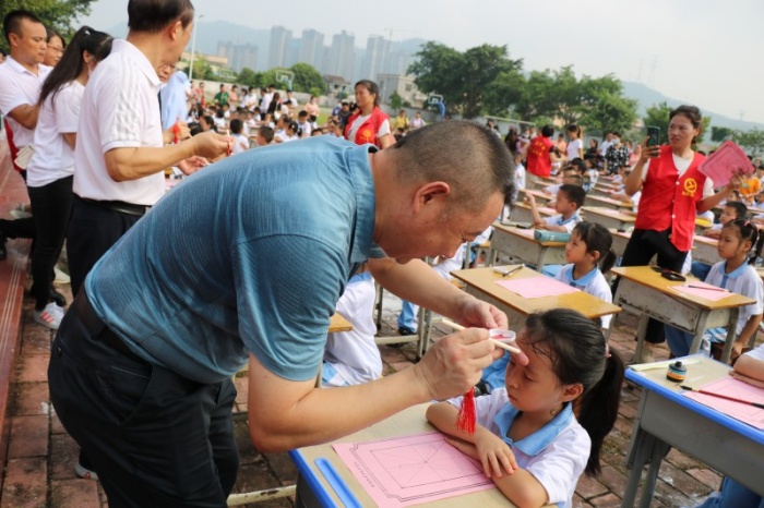 開筆禮是古代啟蒙教育之初舉行的“拜師禮”,開筆禮是祖國(guó)傳統(tǒng)的禮儀習(xí)俗,禮儀文化,本次神舟學(xué)校德育處主持開展的“開筆禮”活動(dòng),共設(shè)有5個(gè)環(huán)節(jié),分別是:正衣冠 、“拜師禮”、“朱砂啟智”、“擊鼓明志”、“啟蒙描紅,授開筆’人’字”。活動(dòng)現(xiàn)場(chǎng)全體學(xué)生,先是一起拜啟蒙恩師,再由老師們?yōu)楹⒆狱c(diǎn)朱砂開“天眼”,最后由家長(zhǎng)們和自己孩子共同書寫“人”字,引導(dǎo)孩子們學(xué)會(huì)做人。