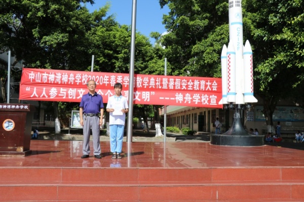最后是神舟學校常務奚水清校長致散學典禮詞。奚水清校長回顧了本學期疫情防控期間,學校在線上進行的教學活動,及復學后在教學、德育工作方面所開展的工作進行一次全面的總結 。奚水清校長對師生們,能在本學期里,克服種種困難,努力學習,且在期末取得優秀的成績,表示肯定及感到欣慰。他要求學生們,暑假里,要寫好暑假學習計劃和暑假生活計劃,平時要注意防疫,防溺水,防意外傷害的發生。要遵守社會公德,遵紀守法,做合格的中小學生,為中山市創文明城市貢獻自己的一份力量。