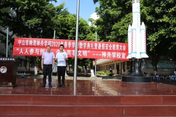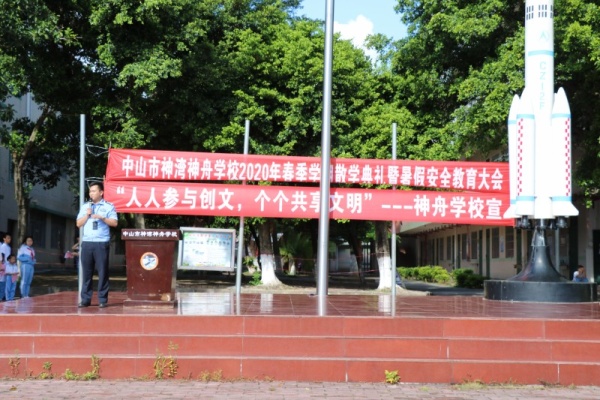 2020年7月17日上午,中山市神灣神舟學校在操場上舉行了“2020年春季學期散學典禮暨暑期安全教育活動”。典禮儀式由神舟學校德育主任——韋德敏主持。全體師生共同參加,校長熊江華、常務校長奚水清出席典禮大會。