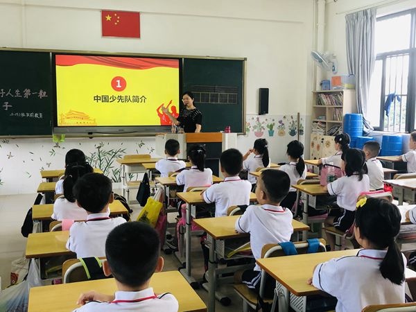 各中隊(duì)輔導(dǎo)員制作了精美的課件,為同學(xué)們詳細(xì)介紹了隊(duì)名、隊(duì)旗、隊(duì)徽、隊(duì)標(biāo)志、隊(duì)禮、隊(duì)歌、呼號(hào)等有關(guān)少先隊(duì)的知識(shí),理解了“先鋒”一詞的含義,還就中國少年先鋒隊(duì)光榮的歷程等知識(shí)作了解讀。同學(xué)們認(rèn)真地學(xué)習(xí)敬隊(duì)禮,學(xué)習(xí)呼號(hào),學(xué)習(xí)戴紅領(lǐng)巾,跟著老師讀誓詞,稚嫩的聲音里透著堅(jiān)定,緊握的拳頭顯示著信心;唱隊(duì)歌,唱一唱《少年先鋒隊(duì)隊(duì)歌》——“我們是共產(chǎn)主義接班人,繼承革命先輩的光榮傳統(tǒng),愛祖國,愛人民,鮮艷的紅領(lǐng)巾飄揚(yáng)在前胸……”為了加入自己夢寐以求的少先隊(duì),孩子們個(gè)個(gè)都精神飽滿,在老師的指導(dǎo)下群情激昂,高唱著隊(duì)歌。一張張純真的小臉流露著孩子們對隊(duì)組織的向往和崇敬,清脆的童聲表達(dá)著孩子們即將成為少先隊(duì)員的自豪和喜悅,也流露著他們加入少先隊(duì)組織的堅(jiān)定決心;敬隊(duì)禮,需要充分發(fā)揮家庭的作用,學(xué)校與家庭密切配合,要求每個(gè)同學(xué)在入隊(duì)前做一件好事。內(nèi)容豐富的隊(duì)前教育,使一年級(jí)新生初步了解了少先隊(duì),讓他們擁有少先隊(duì)生涯的美好開端,也培養(yǎng)了他們的組織意識(shí),增強(qiáng)了作為一名少先隊(duì)員的強(qiáng)烈歸屬感和自豪感!