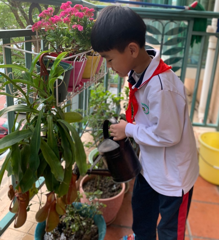 在家庭里,同學(xué)們紛紛參與到養(yǎng)花種菜、養(yǎng)護(hù)綠植的生活勞動(dòng)實(shí)踐,為家中的植物修剪枝葉、松土、除草、澆水,用心呵護(hù)家中的一花一木。