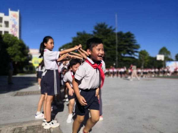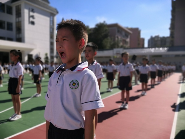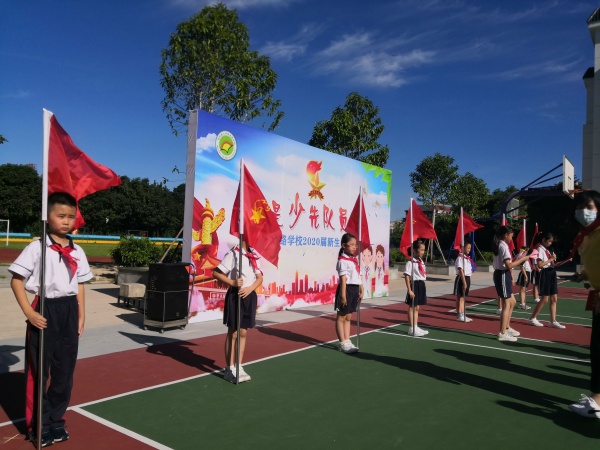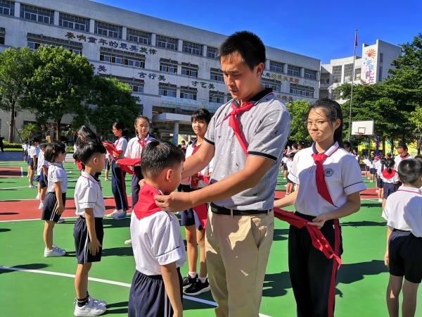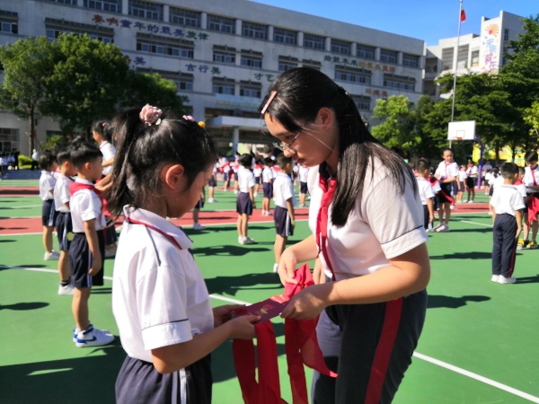“我們是共產主義接班人,繼承革命先輩的光榮傳統......”齊聲響亮的《中國少年先鋒隊隊歌》響徹學校籃球場,大隊輔導員光榮地宣布新隊員名單。“紅領巾,胸前飄,星星火炬,代代相傳”,學校行政、輔導員老師、各年級少先隊員紛紛為一年級同學戴上鮮艷的紅領巾,“從今天起,你就有一個新的名字——少先隊員,請珍惜和愛護胸前的紅領巾,奮發向上,為它增光添彩”!戴上紅領巾后,新隊員們神采奕奕,在火紅的隊旗下,挺胸、握拳,在大隊輔導員的帶領下,向隊旗莊嚴宣誓,那一張張洋溢幸福和自豪的笑臉,在紅領巾的映襯下更加燦爛。