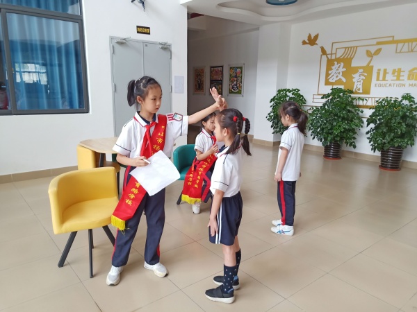 校少工委還開設紅領巾小課堂,從復學返校后,大隊委們大手拉小手,每天下午每班10名大隊委同學走進一年級,點對點、手把手教預備隊員們如何佩戴紅領巾、行隊禮等等。同時,通過對每位預備隊員們的考察,確保全員掌握并通過,才能擁有參加光榮的入隊儀式的機會。預備隊員們,在大隊委的指導下,認真學習,規范每個動作,用實際行動向少先隊組織努力靠攏。