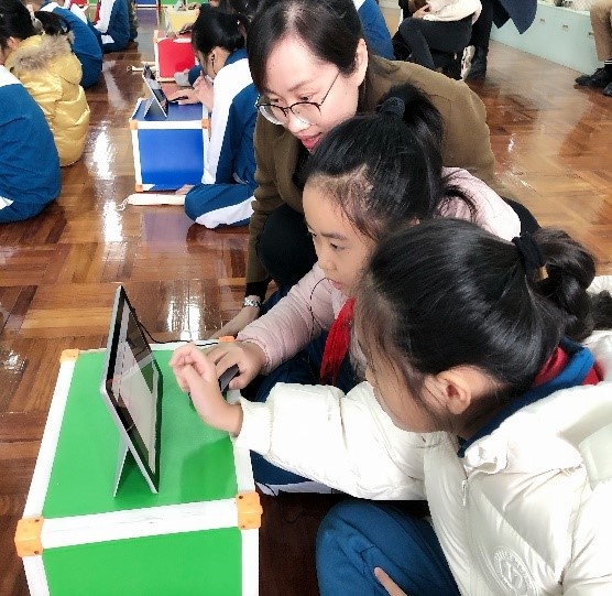 首先由石岐中心小學大信學校謝華老師帶來四年級豎笛旋律創編課《吹好sol la si》。謝老師重點教授豎笛sol la si的吹奏指法。她通過三條節奏練習讓學生熟悉sol la si三個音的指法,隨后用“師問生答”的方式引導學生進行旋律創編,鞏固了學生對sol la si三個音的指法掌握,最后學生兩人一組在平板設備上通過西貝柳斯軟件用sol la si三音進行旋律創編并展示。謝老師教學設計新穎獨特,在傳統課堂的基礎上加入了數字化信息設備,各個環節環環相扣,層層深入,為大家帶來了一節豎笛與創編相結合的優質課。謝老師這一節音樂課又“新”又“潮”,華師附小的老師直言讓人大開眼界,令人稱奇。