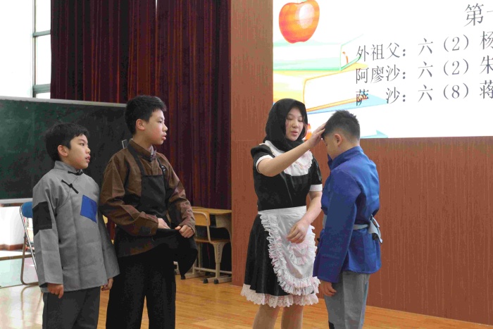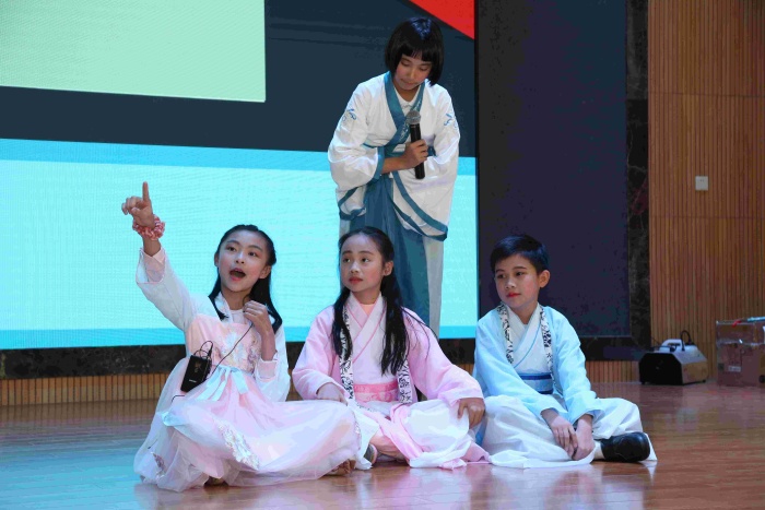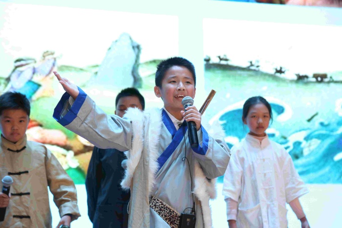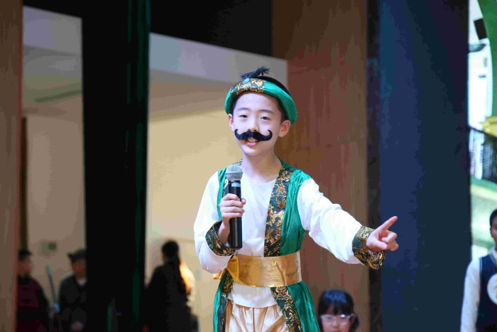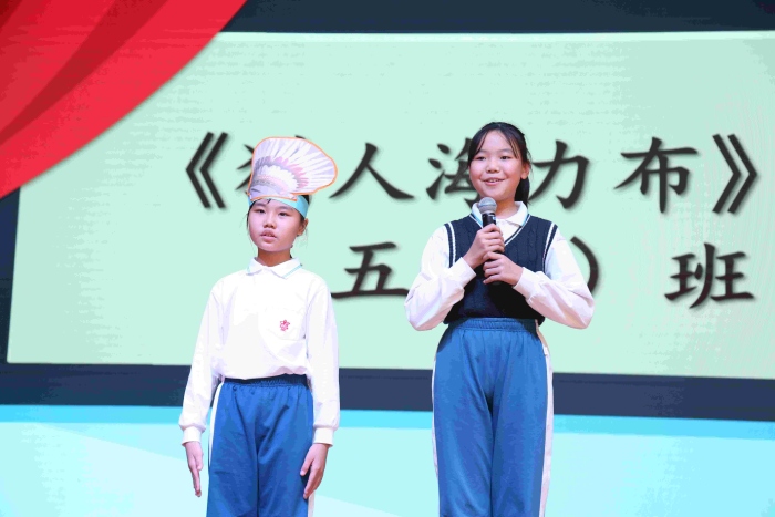 五年級民間故事展演,孩子們在舞臺上詮釋了中國古代民間故事的魅力。《沉香救母》讓人動容;《貍貓換太子》《牛郎織女》《獵人海力布》《阿凡提的故事》《西門豹治鄴》扣人心弦……