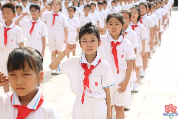 艷陽高照的六月熱情似火,石岐中心小學大新學校校園內隊歌嘹亮,全體校領導和一年級師生在升旗廣場上為104名2019級一年級學生隆重開展了第一批新隊員入隊儀式。孩子們身著整齊的校服,臉上洋溢著燦爛的笑容,他們期盼已久的時刻終于來臨了——加入光榮的少先隊組織。
