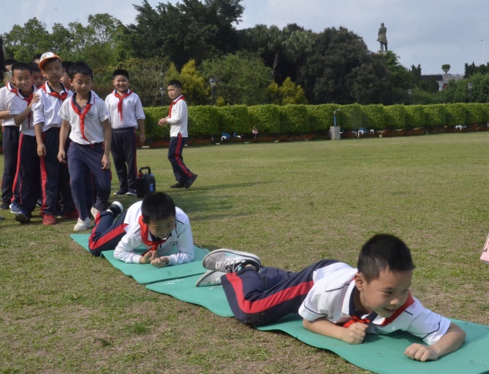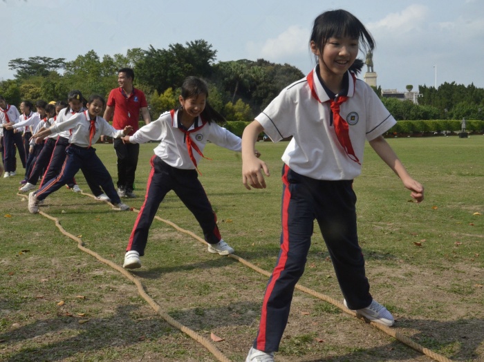 在孫文紀(jì)念公園里,隊(duì)員們進(jìn)行拓展活動(dòng),模擬紅軍長(zhǎng)征途中經(jīng)歷的“四渡赤水”“飛奪瀘定橋”“翻雪山”“過(guò)草地”等場(chǎng)景?!凹t軍不怕遠(yuǎn)征難,萬(wàn)水千山只等閑?!标?duì)員們翻過(guò)一座座“雪山”,走過(guò)一段段“草地”,渡過(guò)一條條艱險(xiǎn)的“河流”,體驗(yàn)紅軍在長(zhǎng)征中翻山越嶺、克服重重困難的艱辛歷程。有的隊(duì)員們圍坐在一起,講述紅軍二萬(wàn)五千里長(zhǎng)征路上的動(dòng)人故事和艱苦奮斗的革命精神;有的隊(duì)員們高唱《紅星閃閃》《沒(méi)有共產(chǎn)黨就沒(méi)有新中國(guó)》等歌曲,唱響愛(ài)黨愛(ài)國(guó)的最強(qiáng)音。