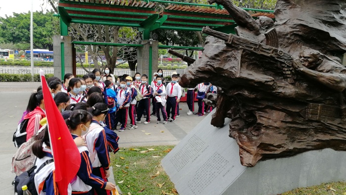 徒步行進(jìn)中,各中隊(duì)模擬了紅軍轉(zhuǎn)運(yùn)物資、運(yùn)送軍糧的情景,體驗(yàn)紅軍長(zhǎng)征團(tuán)結(jié)合作、不畏艱難的精神。來(lái)到中山國(guó)防教育公園后,隊(duì)員們觀看了園內(nèi)的主題雕塑作品、革命英雄事跡故事展板,他們還在公園的中軸線展示板前駐足停留,了解八一南昌起義、抗日戰(zhàn)爭(zhēng)等歷史事件。