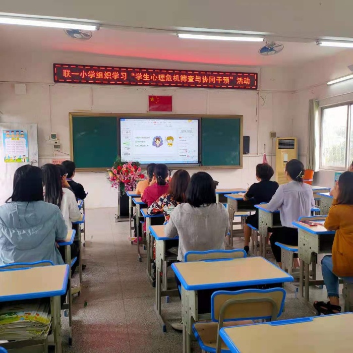 為貫徹《廣東省中小學心理健康教育行動計劃》關于“完善學生心理危機預防、預警、干預工作體系”的工作要求,落實《中山市兒童青少年心理健康三年行動計劃》中“編織精準計時的心理健康預警網絡和構建穩妥有力的心理健康干預機制”任務,促進學生身心健康,建立和諧校園。2021年3月18日上午,中山市坦洲鎮聯一小學全體班主任及心理教師直播觀看中山市中小學“學生心理危機篩查與協同干預”主題研討活動。