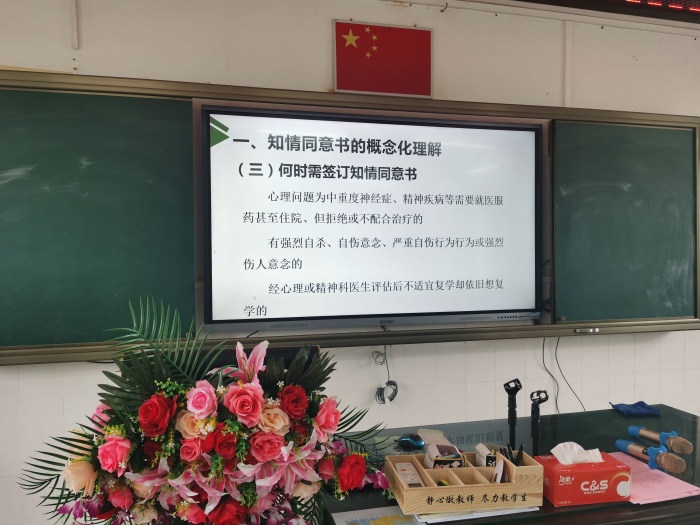 本次學習活動由德育主任甘群帶主持,各班主任及心理教師認真聽取了《中小學心理危機學生的三步篩查法》、《校園心理危機干預的家長應對》、《心理危機學生知情同意書的簽訂方法與策略》等主題報告,收獲良多。在《心理危機學生知情同意書的簽訂方法與策略》主題報告中,報告人石碩老師提出“多方會談,明細責任”“委婉表達,統一戰線”“充分告知,注重解釋”“消除疑慮,靈活應對”等策略,為老師們提供了清晰的“家校”聯同干預方法;在《論重點學生的協同聯動干預——一例校園心理危機的個案報告》主題報告中,報告人劉穎老師借助個案,講授家校如何協同干預,指明了學生心理危機協同干預的方向。