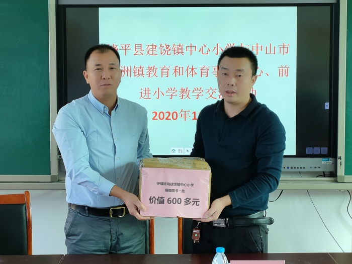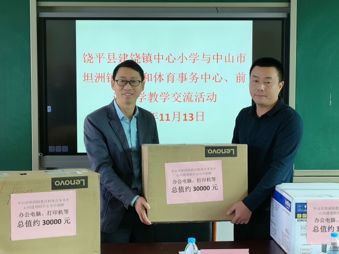 隨后,由張志略主任代表坦洲鎮教育和體育事務中心、郭炳森校長代表坦洲鎮前進小學教職員工和熱心人士分別向建饒鎮中心小學捐贈教學設備。 下午,一行走訪了遠離鎮區的秀溪小學,向秀溪小學的全體學生捐贈了文具,并勉勵同學們好好學習。