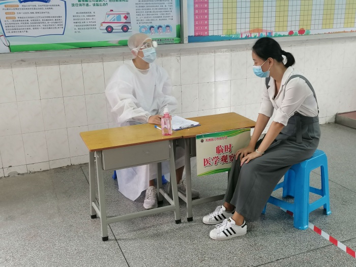 上午10點(diǎn)整,演練正式開始。其中著重演練課中突發(fā)事件的情景令人印象深刻,各位老師都投入到安排好的角色中。上課期間,一名學(xué)生報告老師不舒服課,有咳嗽和嘔吐癥狀。上課老師隨即指揮班干部轉(zhuǎn)移其他學(xué)生,通知醫(yī)學(xué)觀察老師處理。該生來到留觀室醫(yī)學(xué)觀察老師初步了解生病學(xué)生的情況,了解其近14天內(nèi)流行病學(xué)史。經(jīng)過測溫發(fā)現(xiàn)學(xué)生體溫異常,初步判斷其為非新冠肺炎可疑病例。緊接著,醫(yī)學(xué)觀察老師讓班主任老師通知家長到校接生病學(xué)生就醫(yī)。隨后,醫(yī)學(xué)觀察老師把情況報告學(xué)校領(lǐng)導(dǎo)。整個演練過程有條不紊。