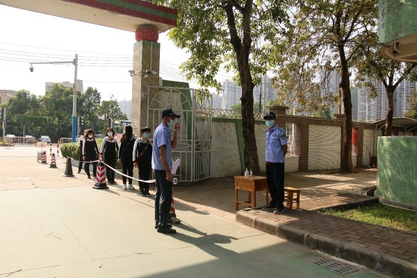 當日的演練活動模擬開學第一天重點環節的運行和對突發事件的應急處置。演練由10名教師扮演學生和校醫,門衛、后勤工作人員全程參與演練。整個演練包含學生錯時入校、學生入班晨午檢及課中突發事件的應急處置等三個環節。同時,學校大門口處用學生桌設置了兩個入口通道,用警戒帶隔開。入口處標識排隊站位點,間隔1米。每個通道都配有兩名工作人員,學生桌上放著一個紅外測溫槍、一瓶免洗洗手液和消毒酒精噴霧。