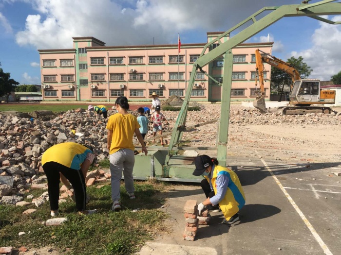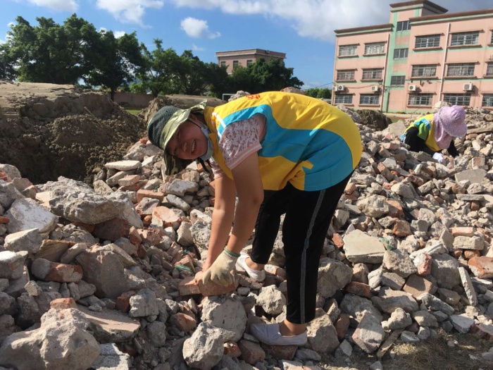 7月28日上午,在新合小學范田華校長的倡議下,由德育主任盧國慶組織安排,各班主任積極發動家長及學生回校參與對已拆除的學校教學樓中有再次使用價值的磚塊撿出來的親子志愿活動。家長們、老師們組成的志愿者隊伍迅速、有序地投入活動,一部分志愿者負責篩選有價值的磚塊,一部分志愿者負責用推車把磚塊運到固定存放的地點,烈日當空,志愿者們都在貢獻自己的力量,有幾個高年級的學生已經汗流浹背了,但臉上依然露出開心的笑臉。雖然天氣很惡劣,但是志愿者們都是迅速喝了水馬上又投入工作了。整個志愿活動持續兩個多小時,志愿者們在這片廢墟下留下了美麗的倩影。